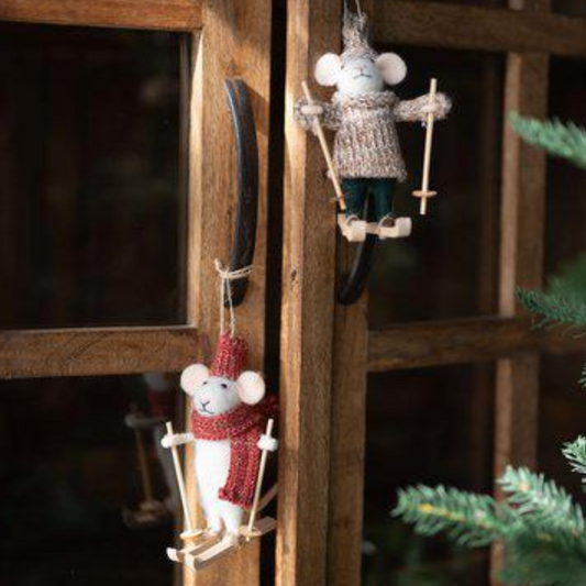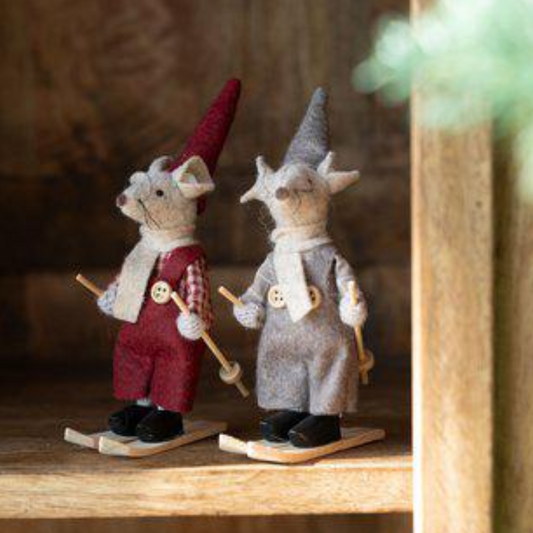 Mus med skidor i ull från Wikholm Form, röd/grå