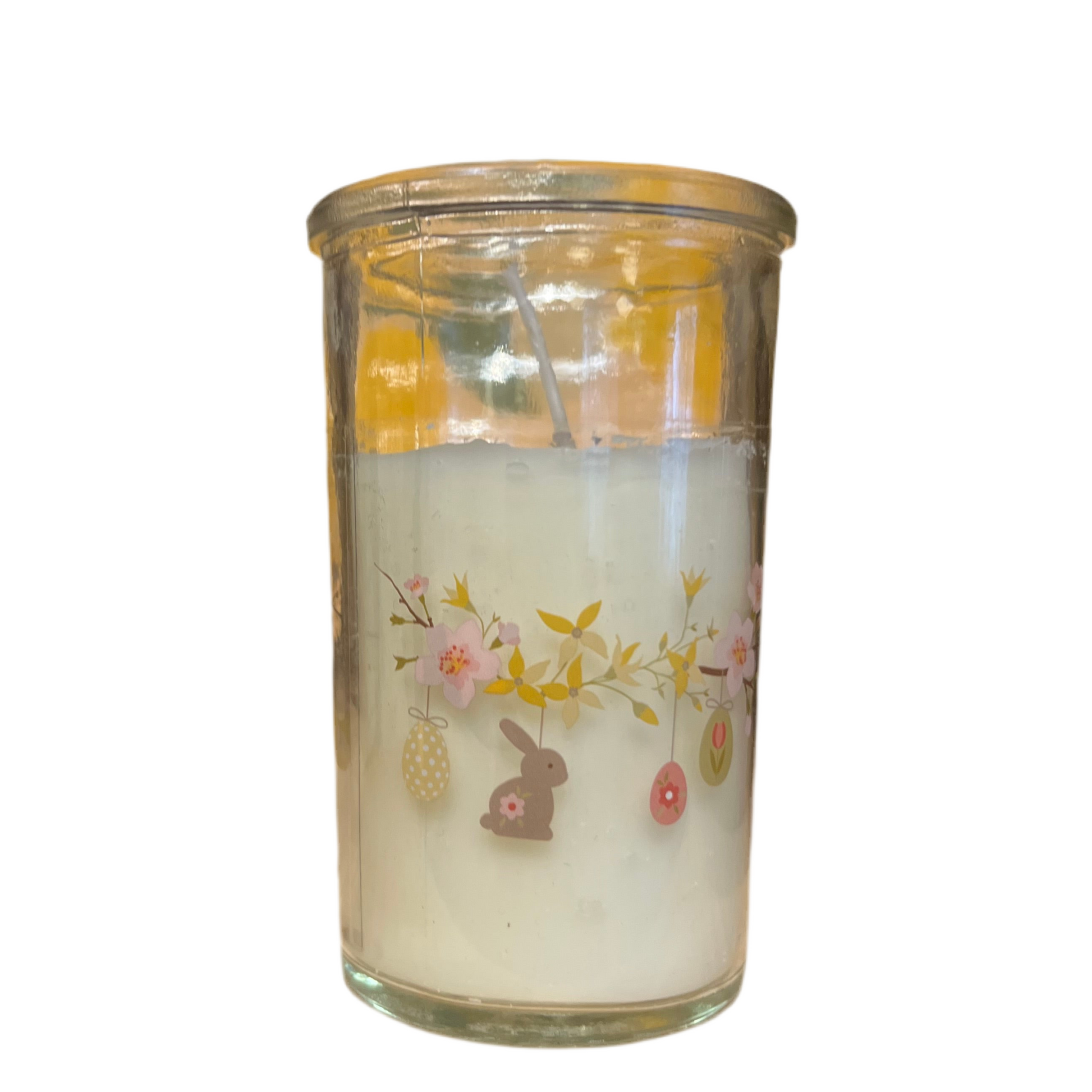 Ljus i glas från POP Retail med ett vackert mönster av kycklingar och påskliljor. En vårig och dekorativ detalj som passar fint på bordet, i köket eller på påskdukningen. Glaset med det charmiga motivet blir en fin inredningsdetalj även efter att ljuset brunnit ner – perfekt att spara och använda som liten vas eller förvaring.
