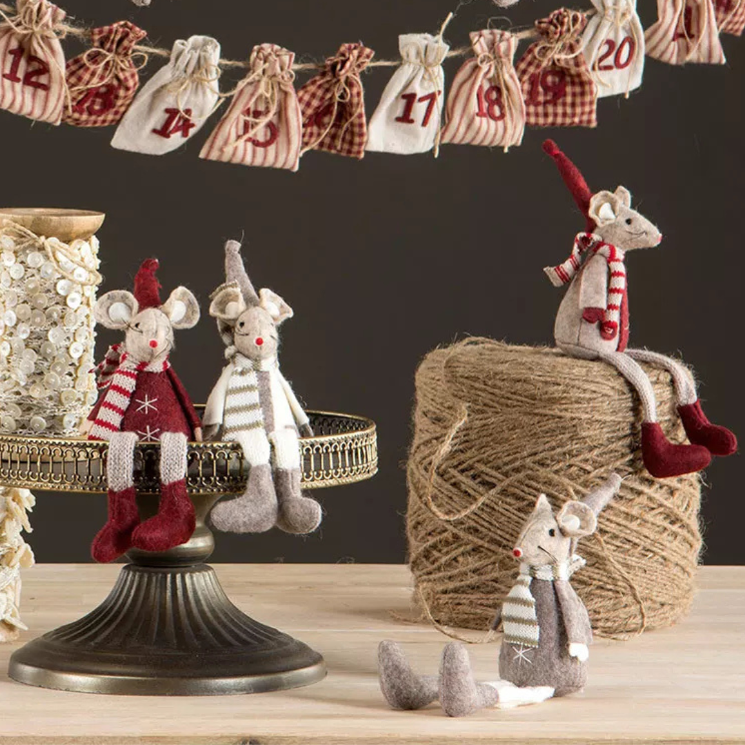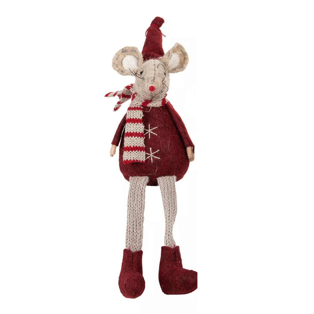 Dessa charmiga sittande möss i vinröd och mullvad mix ger ett mysigt och lekfullt inslag i din inredning. Perfekta som dekoration under jul.